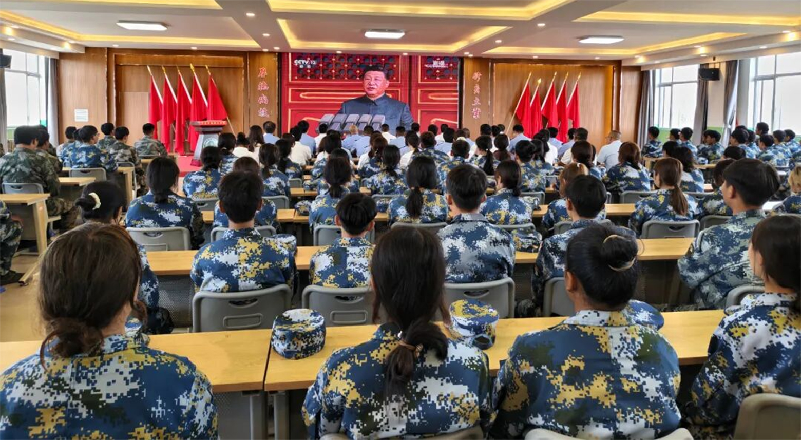 活动伊始,全体人员集中观看纪念中国人民抗日战争暨世界反法西斯战争胜利80周年阅兵仪式。当45个方(梯)队以铿锵步伐通过天安门广场,当新型主战装备、战略导弹等大国重器震撼亮相,礼堂内爆发出阵阵掌声。师生们凝神注视屏幕,仿佛置身于那场彰显民族尊严的盛典之中,