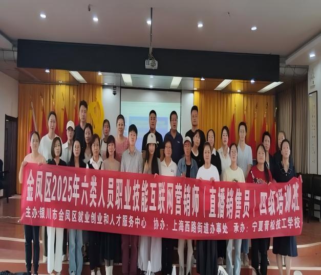 7月18日至8月8日,由金凤区就业创业和人才服务中心主办、宁夏青松技工学校承办的互联网营销师(直播销售员)中级培训班,在上海西路街道办事处五楼会议室如期开班并顺利落幕。经过20天的系统集训,32名参训学员中29人成功通过考核,拿到结业证书,为投身直播电商行业、实现就业创业筑牢基础。